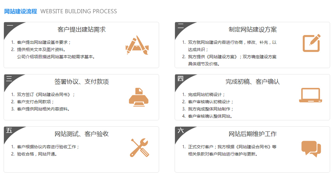 采用一體(tǐ)化服務模式,從基礎産品、設計(jì)開(kāi)發到優化推廣、售後服務,提供全程網站(zhàn)建設服務與衍生(shēng)産品服務。我們的服務永不設服務期限。提供多(duō)達百餘項的技(jì)術(shù)服務細則。